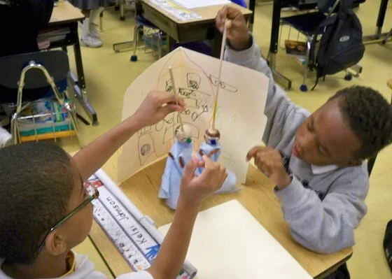Second Grade students accompanied poem readings with what they inferred “between the lines” as simple rod puppets